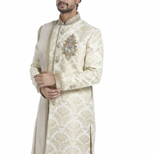 Pamper yourself with this royal classy Sherwani befitting your look at any sangeet, reception or party. Laced in Royal Brocade fabric, this biscuit coloured wear radiates an elevated look with very minutely crafted hand embroidery. For all those who love the Indian look, this is a must-have in your wardrobe. The Sherwani ensemble comes with a pair of Churidar and a Dupatta.